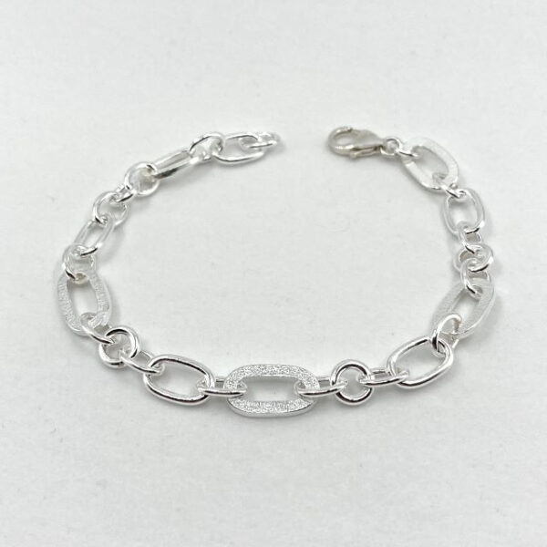 The Blue Bracelet is a repeating pattern of textured ovals, with polished oval and round links.  The links are connected with polished oval and round links.  The bracelet has a sterling silver lobster clasp.
